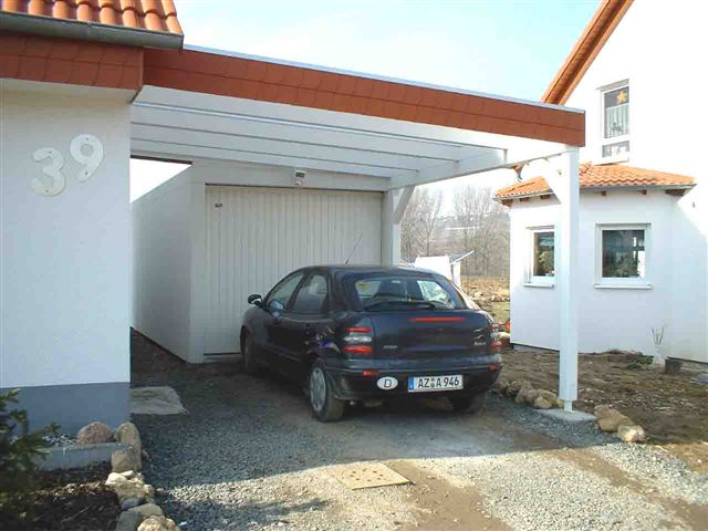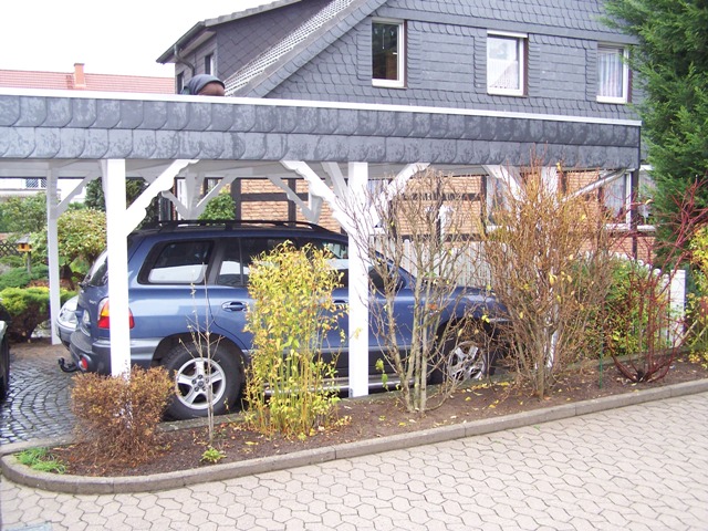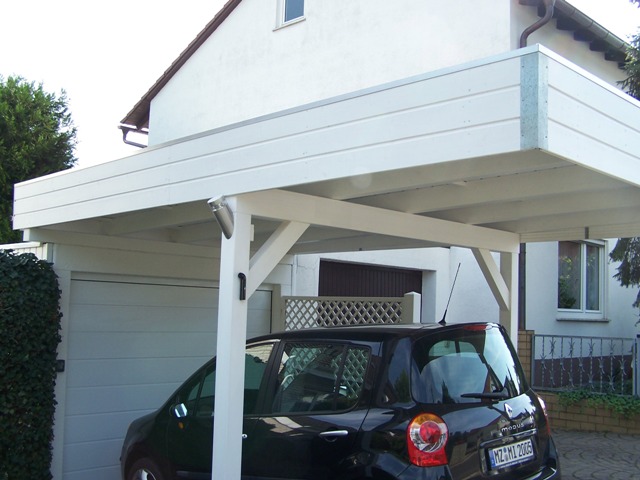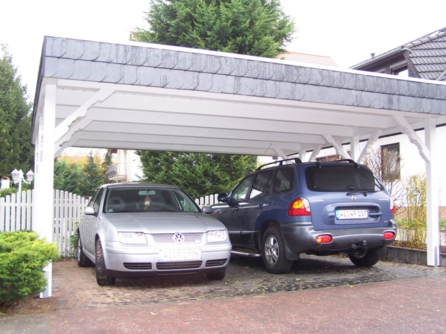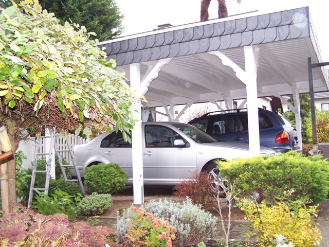 OWOFIL-Carport weiß mit Naturschieferblende und Profilholzschalung