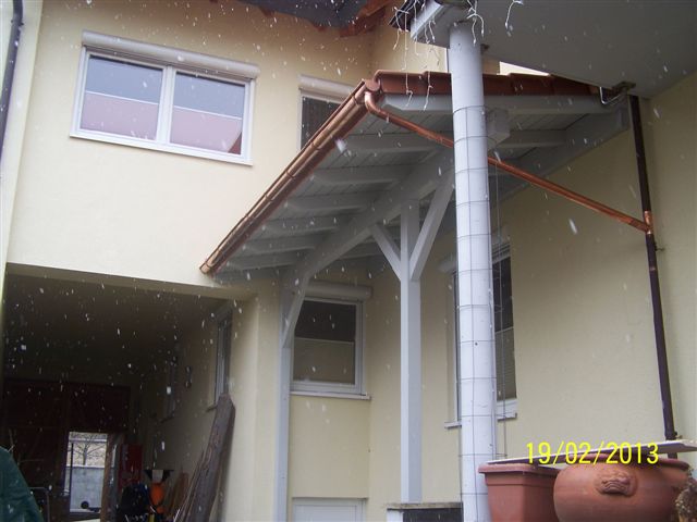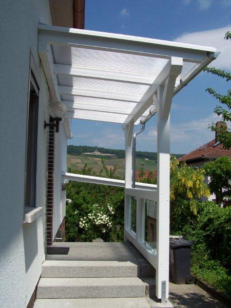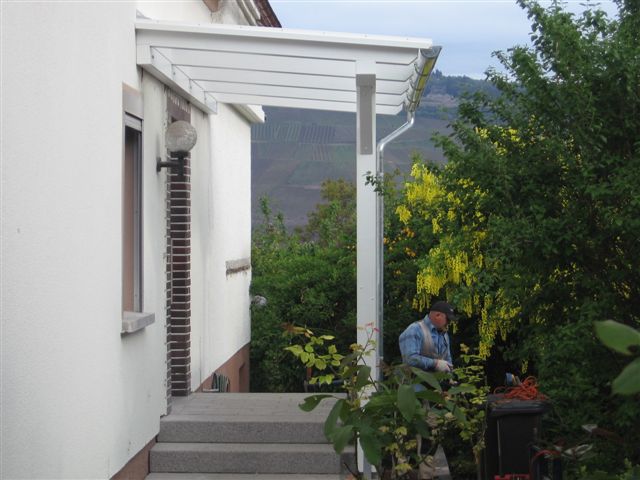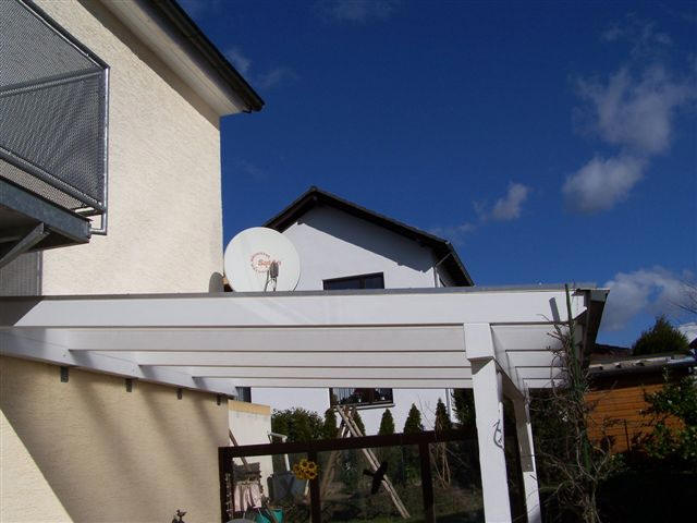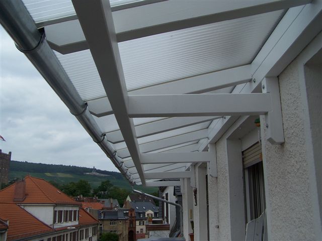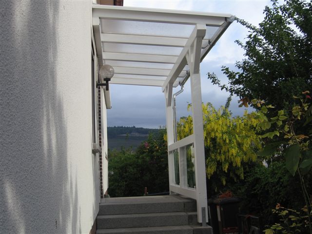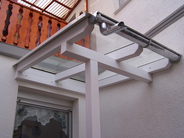 Satteldach weiß, VSG, weiße Kunststoffrinne