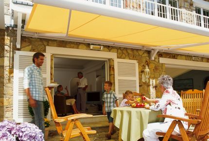 Im ausgefahrenen Zustand zeigt sie ihre ganze Eleganz, denn sie macht ganz schön was her. Und das bei einer Kassettenhöhe von nur 14,5 cm. Sie hat ordentlich was auf dem Kasten – und vor allem auch darin. Denn die bewährte, moderne weinor-Technik sorgt dafür, dass das hochwertige Tuch vollständig in der Kassette verschwindet. Geschützt vor Nässe und Umwelteinflüssen. Durch die geringe Kassettenhöhe meistert sie auch schwierige Montagesituationen und zeigt dann im ausgefahrenen Zustand ihre Eleganz.